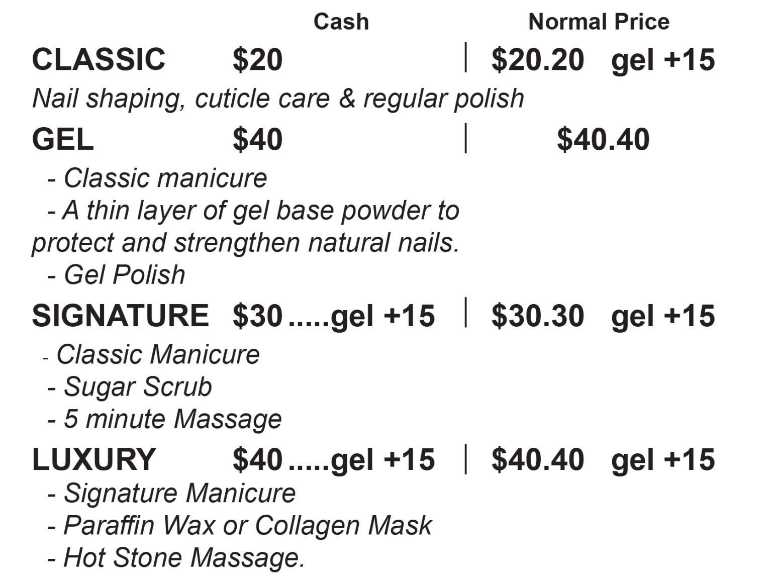 To hold prices down all pricing is marked as paying by Cash or Gift Cards and receive a 1% discount. 1% Non-Cash Adj is applied to all other sales